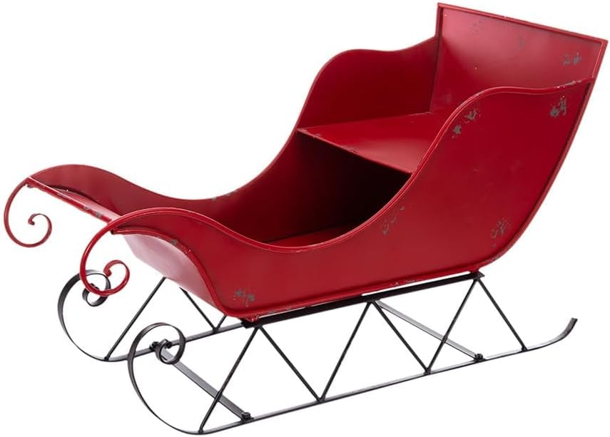 - CHRISTMAS SLEIGH DESIGN: Vintage sleigh brings color and life to your home. Made of stable iron, features an peeling paint distressed design, it will last season after season! Enjoy beautiful Christmas with this large red sleigh container shelf candy basket