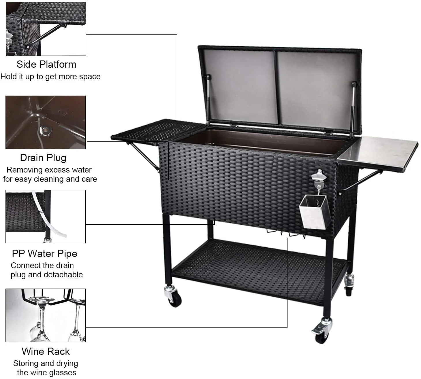 - ��Convenient Features�� �� Built-in bottle opener, drain plug removing excess water, for easy cleaning and care, the frame has the setting of fixed water pipe. A durable thick oxford waterproof cover is also given as a gift, which protects your cooler cart damage from rain, sun, snow, dust, dirty, leaves, etc. Comes with detailed instructions, all the needed hardware and tool, are included, super easy to assemble